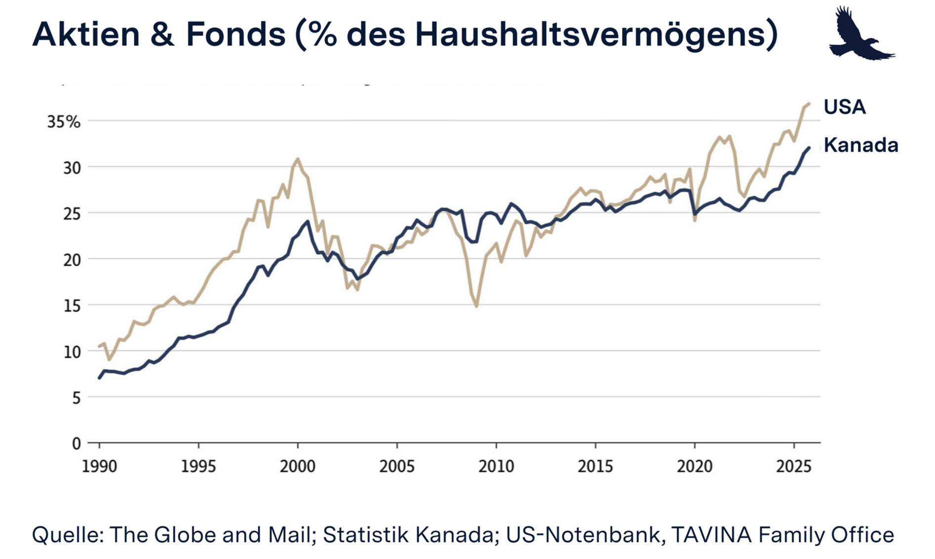 Diese Dynamik schlägt auch auf die Finanzmärkte durch. Anleiherenditen und Hypothekenzinsen sind stark gestiegen, während Aktienmärkte unter Druck geraten. Für viele Haushalte bedeutet dies eine doppelte Belastung: höhere laufende Kosten bei gleichzeitig sinkenden Vermögenswerten. Da die kanadischen Haushalte ähnlich wie die der Amerikaner stark im Aktienmarkt engagiert sind, steigt bei zurückgehender Vermögenssituation das Risiko rückläufiger Konsumausgaben, mit negativen Konjunktureffekten.